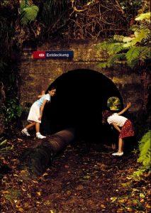 Tolles Bild, die Körperhaltung der fast Entfliehenden ist einfach genial! Tatsächlich finden sich diese zwei Mädchenfiguren bei Cézanne nicht – Wall kopiert nicht sondern aktualisiert die zugrunde liegende Gefühlswelt. Über dieses Foto legt sich bei mir noch ein drittes Bild: 16 Jahre später wird Wall’s Arbeit in einer Werbung der Schweizer Bundesbahnen weitergesponnen, das Unheimliche muss einer gefahrlosen ‚Entdeckung’ weichen und am Ende des Tunnels ist kein dunkles Geheimnis mehr sondern nun – ganz marktkonform – Licht.