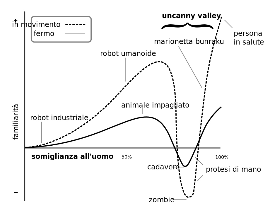 The uncanny valley è un’ipotesi presentata dallo studioso di robotica nipponico Masahiro Mori nel 1970. La ricerca analizza sperimentalmente come la sensazione di familiarità e di piacevolezza generata da robot e automi antropomorfi aumenti al crescere della loro somiglianza con la figura umana, fino ad un punto in cui l’estremo realismo rappresentativo produce però un brusco calo delle reazioni emotive positive, destando sensazioni spiacevoli come repulsione e inquietudine paragonabili al perturbamento che sentiamo quando incrociamo uno zombie.