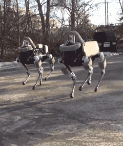 2015 hat Boston Dynamics den neuen Roboter-Vierbeiner SPOT vorgestellt – kleiner und weniger martialisch als sein Vorgänger BIG DOG. Das Spannende an diesem neuen Roboter kann man in Minute 1:20 des Videos bestaunen, als zwei SPOTs zusammen einen Berg hochlaufen, der eine den anderen mehrmals anrempelt, beide die Balance halten, sich parallel zueinander ausrichten  und sich dann oben angekommen in dieselbe Richtung drehen.