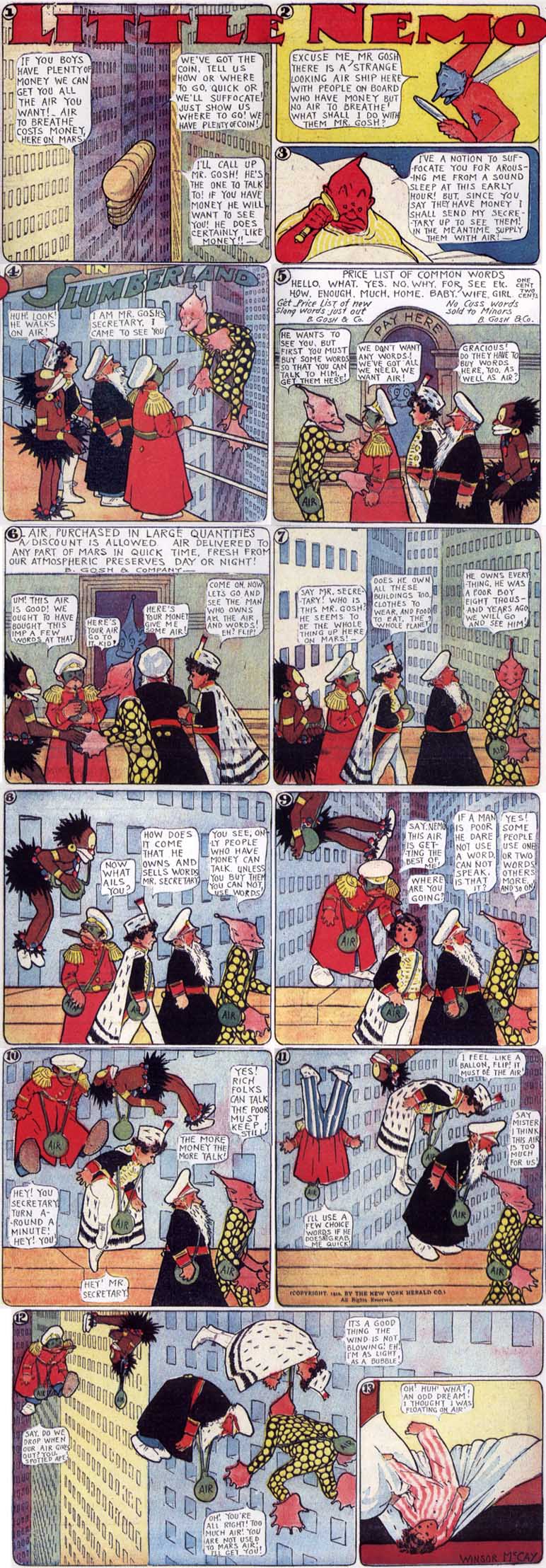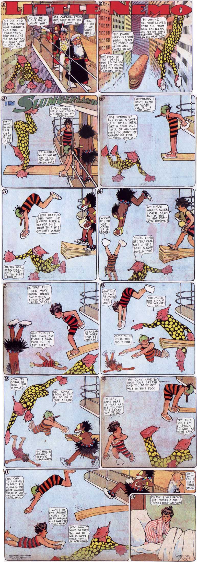 Ab 1905 vom Zeichner Winsor McCay wöchentlich im New York Herald veröffentlicht, erlebt Little Nemo in surrealen Traumszenarien nächtliche Abenteuer auf der Reise nach Slumberland, wo König Morpheus Nemo gerne als Spielkamerad für seine Tochter, die Prinzessin, hätte. Jeder Comic endet immer damit, dass Nemo aus seinen Träumen erwacht.