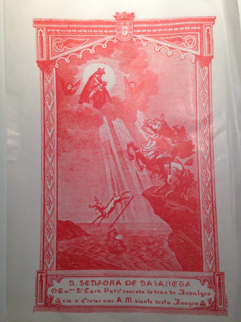 Und tatsächlich übersteht die Statue die etwa 450-jährige Herrschaft der islamischen Mauren unentdeckt in dieser Felsnische. Erst 1179 bei der Reconquista Portugals findet der Ritter Dom Fuas Roupinho bei einer Jagd die Figur, belässt sie aber in ihrem Versteck. Am 8. September 1182, verfolgt D. Fuas auf seinem Pferd im tiefen Nebel auf der Anhöhe von Sítio einen Hirsch, der von der Klippe springt und in die tiefe Bucht von Nazaré stürzt. D. Fuas will gerade dem Hirschen nachsetzen, da erscheint ihm das Abbild Marias, er stürzt sich vom Pferd und ist dadurch gerettet. Zum Dank für dieses Wunder lässt D. Fuas eine kleine Kapelle erbauen. Diese Kapelle wird zum Mittelpunkt der Verehrung des Heiligen Abbildes Unserer Lieben Frau von Nazareth. Im 17. Jahrhundert wird die Kirche in ihren jetzigen Zustand umgebaut und mit Keramikfliesen ausgestattet, sie erhält außerdem eine kleine Tribüne, so dass die Pilger direkt an der Statute vorbeigehen können.