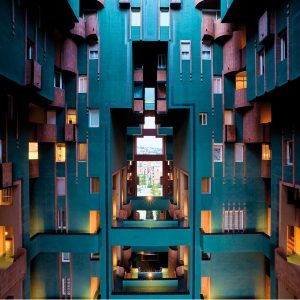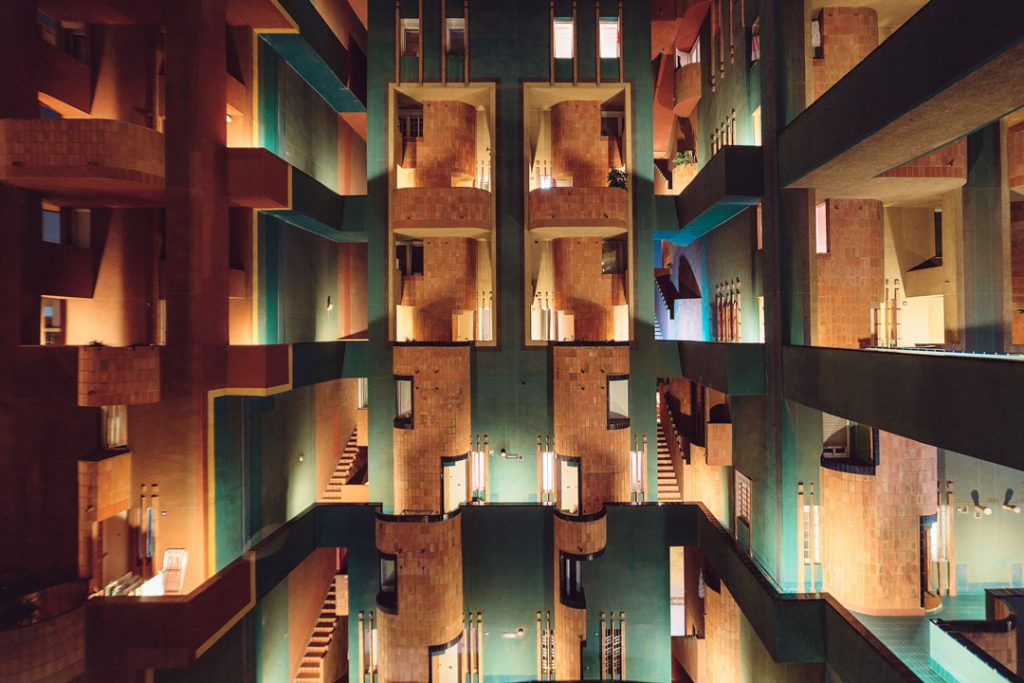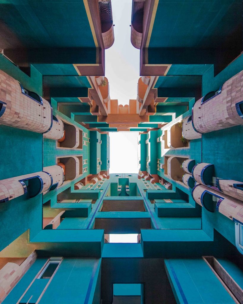 Walden 7 (erbaut 1975) vom katalanischen Architekten Ricardo Bofill, ist die tollste soziale Plastik die ich je besucht habe! Es liegt in der Nähe von Barcelona, direkt daneben – auf dem Foto rechts! – sein Büro in einer alten Zementfabrik. Der Name des Wohnkomplexes wurde von Bofill persönlich gewählt, natürlich bezieht er sich auf den utopischen Roman Walden 2 (1948) des Psychologen Burrhus Frederic Skinner, der wiederum auf Walden (1854) von Henry David Thoreau rekuriert. Aber was will uns Bofill damit sagen?